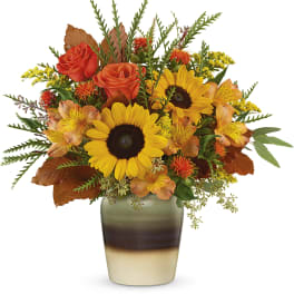 Price: $55.00Sunny Sunflowers in Leaf Lined Glass Cylinder